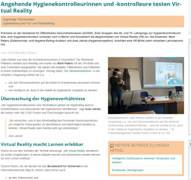 Lesezeit ca. 2 Minuten Angehende Hygienekontrolleurinnen und -kontrolleure testen Virtual Reality Premiere an der Akademie für Öffentliches Gesundheitswesen (AÖGW): Zwei Gruppen des 69. und 70. Lehrgangs zur Hygienekontrolleurin bzw. zum Hygienekontrolleur schauten sich in Berlin und Düsseldorf die Möglichkeiten von Virtual Reality (VR) an. Die Dozenten, Mark Peters (Datenschutz- und Hygiene-Rating-Auditor) und Axel Jakobi (Hygieneinspektor), […]