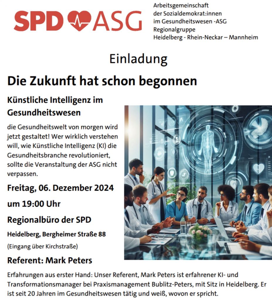 Lesezeit ca. 1 Minuten Künstliche Intelligenz im Gesundheitswesen Am Freitag, den 6. Dezember 2024, lädt die SPD zu einer spannenden Veranstaltung zum Thema „Künstliche Intelligenz im Gesundheitswesen“ ein. Die Veranstaltung findet um 19:00 Uhr im Regionalbüro der SPD in Heidelberg (Bergheimer Straße 88, Eingang über Kirchstraße) statt. Unser Experte, Mark Peters, KI- und Transformationsmanager bei […]