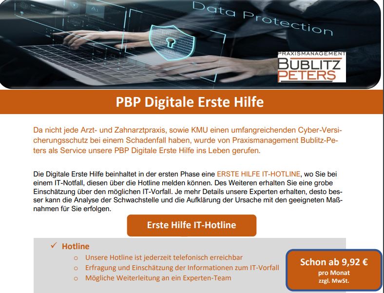 Lesezeit ca. 2 Minuten Erhalten Sie Kostengünstig Digitale Erste Hilfe für Arzt- und Zahnarztpraxen, sowie KMU Mit unserem neuen Service „Digitale Erste Hilfe“ können Institutionen des Gesundheitswesen sowie KMU, die bisher noch keine Cyberversicherung abgeschlossen haben, ein unterstützendes und unbürokratisches Servicepaket in Anspruch nehmen. Sie können durch die Erfahrung von Cyberschutzexperten von Praxismanagement Bublitz-Peters eine […]