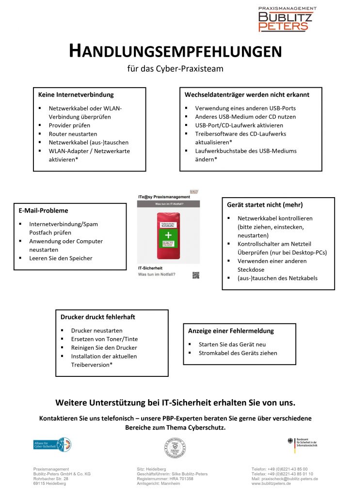 Lesezeit ca. 2 Minuten Angesichts steigender Bedrohungen durch Cyberkriminelle hat Praxismanagement Bublitz-Peters aus Heidelberg Beispiele aus der Praxis im Rahmen des ITe@sy-Praxismanagementsystems zusammengestellt. ITe@sy sensibilisiert und zeigt Handlungsoptionen vor und nach einem Ernstfall. Praxismanagement Bublitz-Peters ist in der Prävention ein unterstützender Begleiter für Praxisteams, denn als BSI-Berater und BSI-Digitaler Ersthelfer können Sie uns jederzeit unabhängig […]