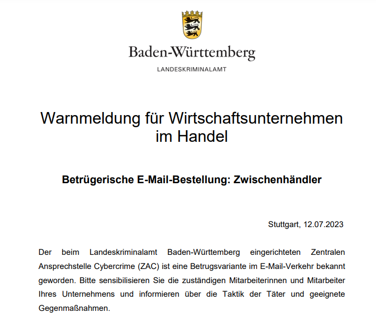Warnmeldung: Landeskriminalamt für Handelsunternehmen – Vorgetäuschte Warenbestellungen
